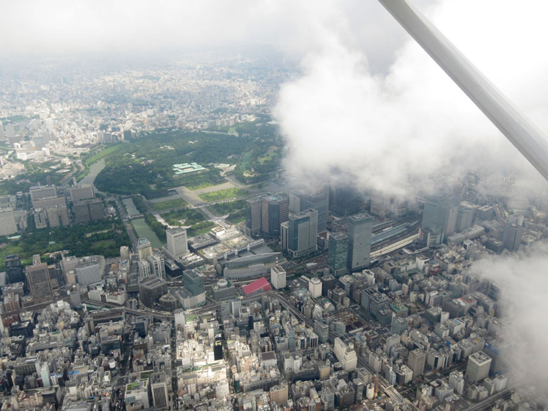 なお雲の下をくぐるのは、東京駅周辺のビルがあるため、