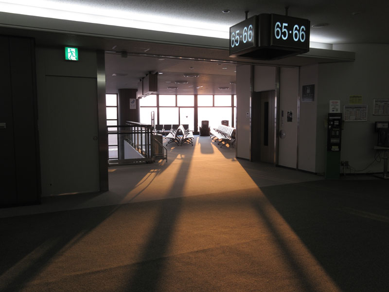 朝が早すぎて誰もいない。差し込む朝日がなぜか夕日のようで絵になる。