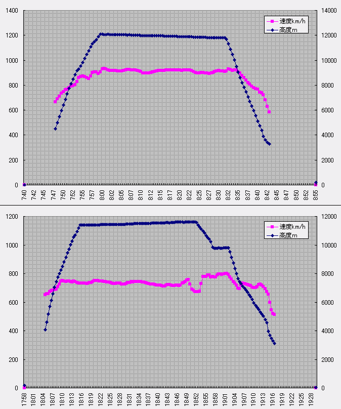 いずれも高度12km程度の高空巡航であり速度もそこそこ。