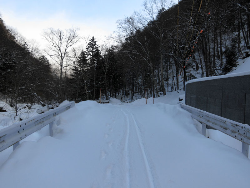 XCスキーの跡が残っているが、これは僕よりも5分前に出発した同じ宿に泊まった人の。
