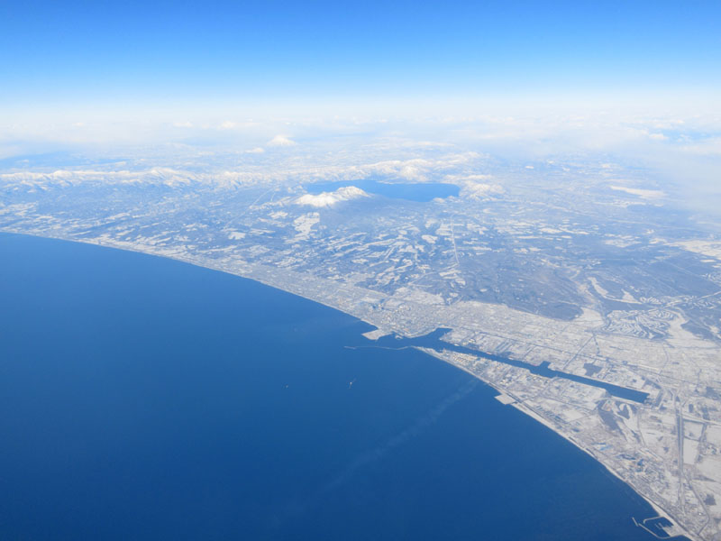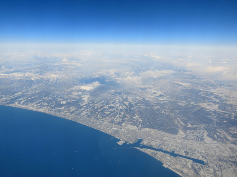 苫小牧の工場地帯から煙突の煙が一直線に南に流れているのがわかる。