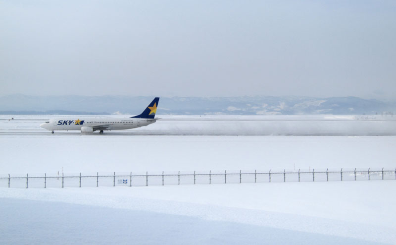 スカイマークの便が雪煙をあげてタクシーしていった。