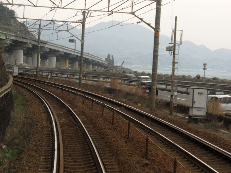 新幹線が超高速(といっても浜松駅はR=2500があり700系は255kmh)で追い抜いていく。