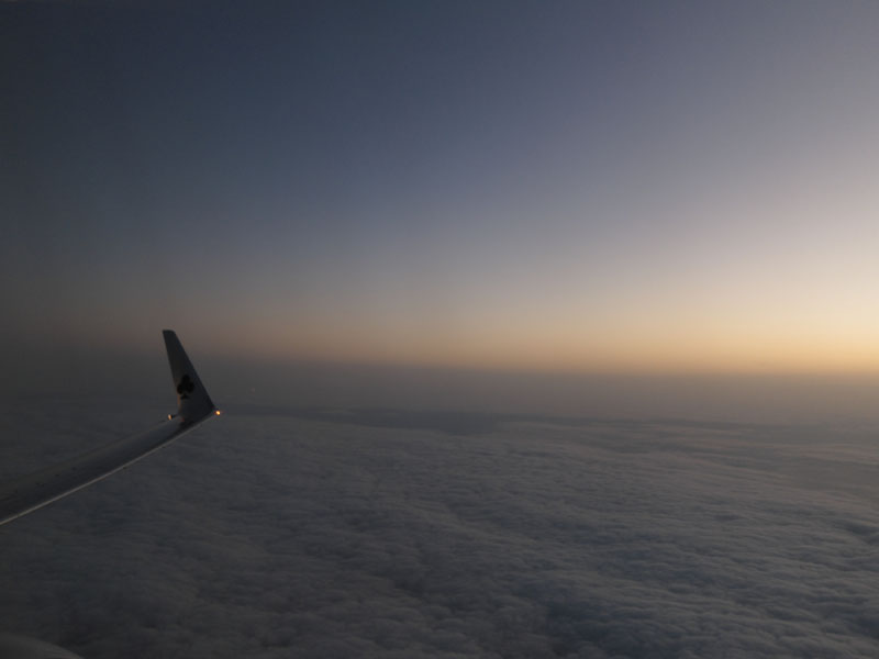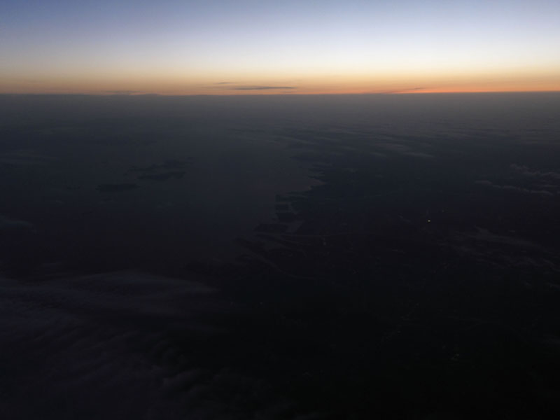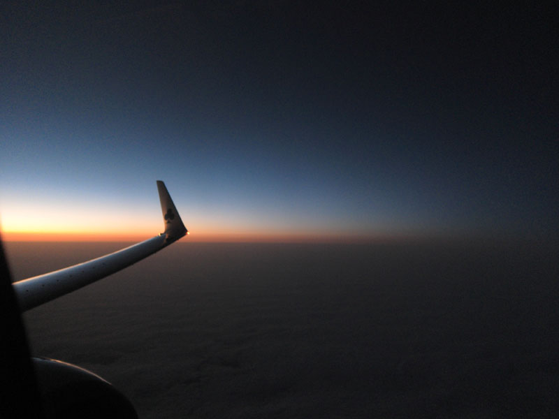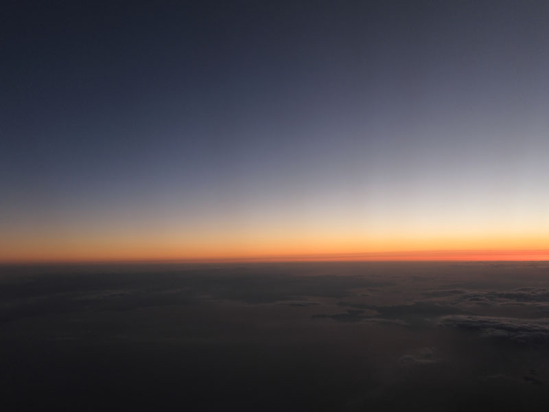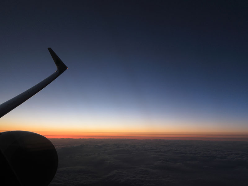 夕日が沈んだころあいでまた成田行きに搭乗だが、夕日が非常に美しい。