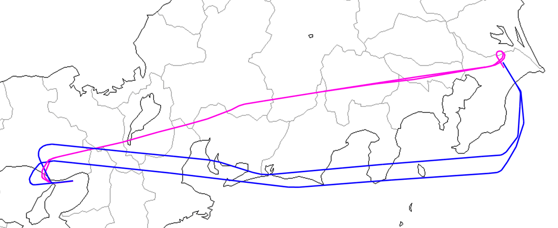 帰り(青)については、伊豆半島くらいまでは一緒であるが、