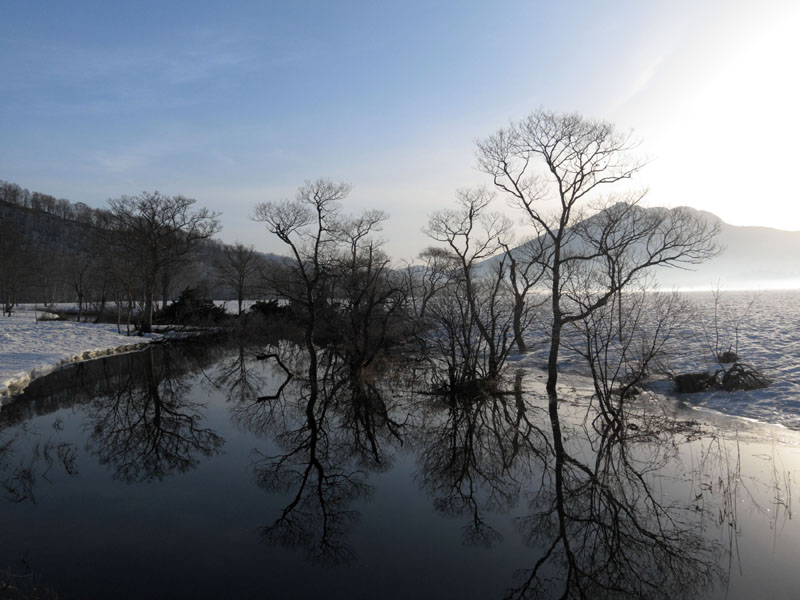 鏡のような水面に霧が出ており幻想的。