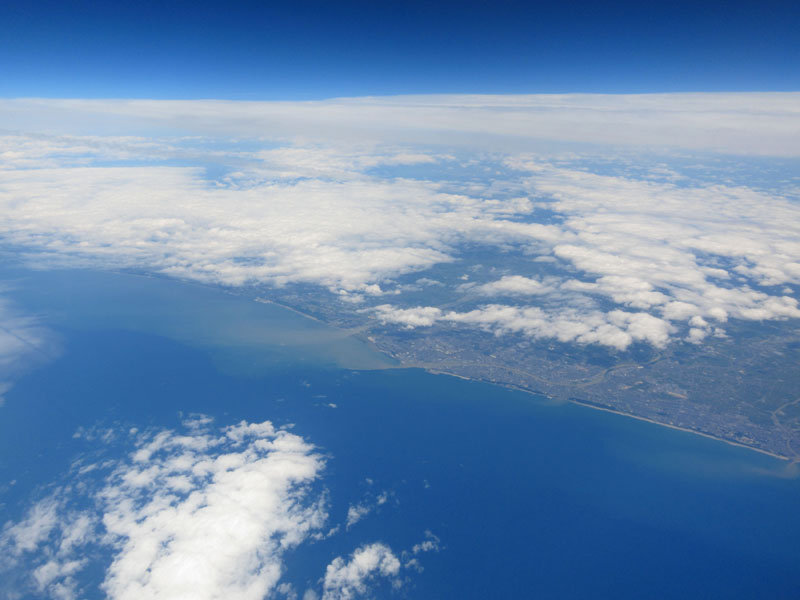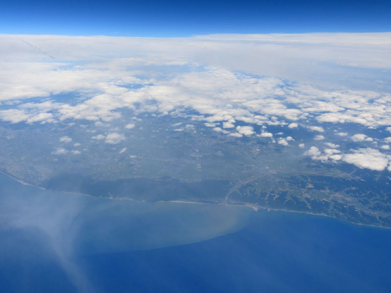 この便だと、進行方向左側の席が逆光になってしまう。右側の席は海しか見えない。