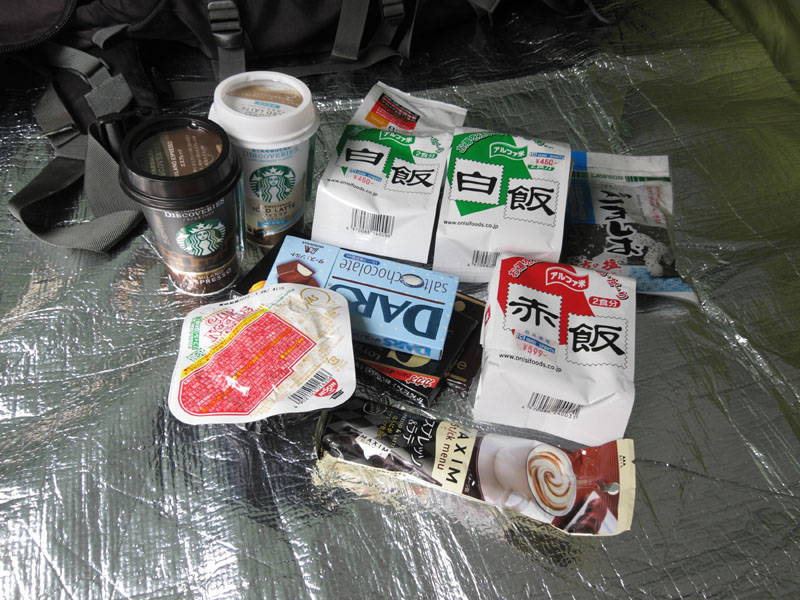 今回搬入食料。カロリーで1日2500k計算で持ち込むが、いつも余る。