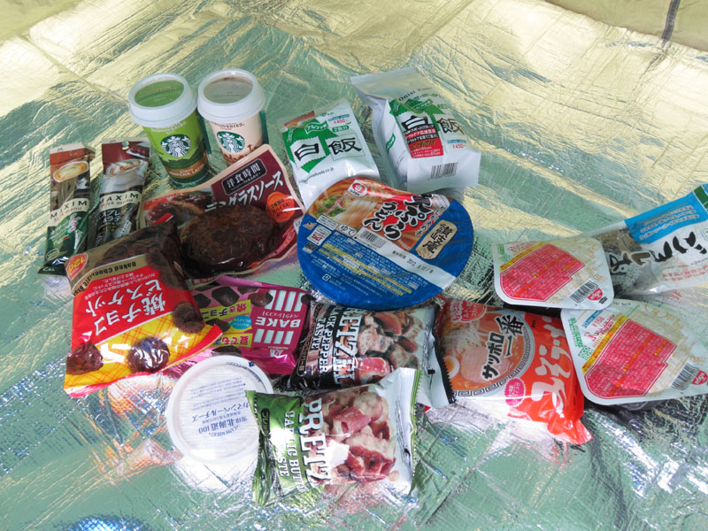 寝袋モンベル#0、水4L、椅子、サンダル、食事などで、