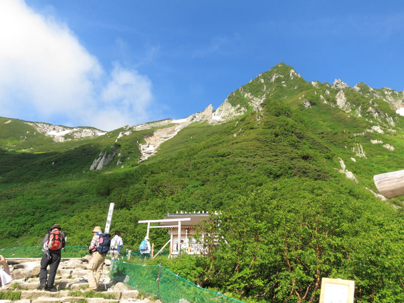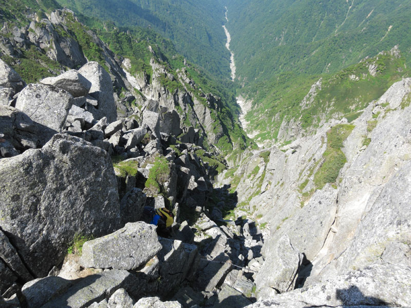 宝剣岳の直下は切れ落ちており1000m以上下が見える。