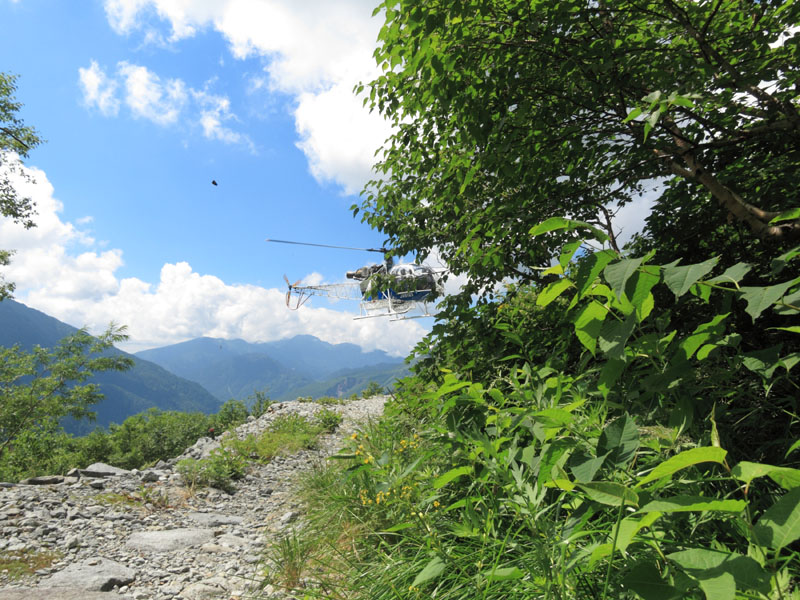 途中の岳沢小屋でヘリ(東邦航空SA315B)に遭遇。