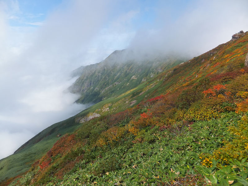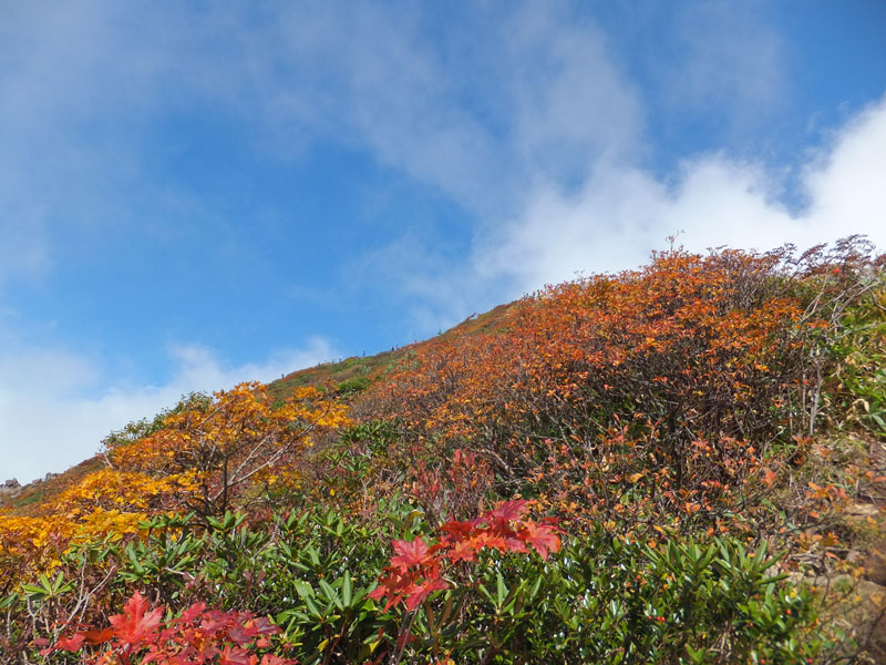 上のほうは少し紅葉しているが、下はさっぱりだな。