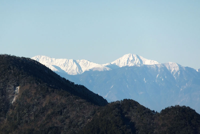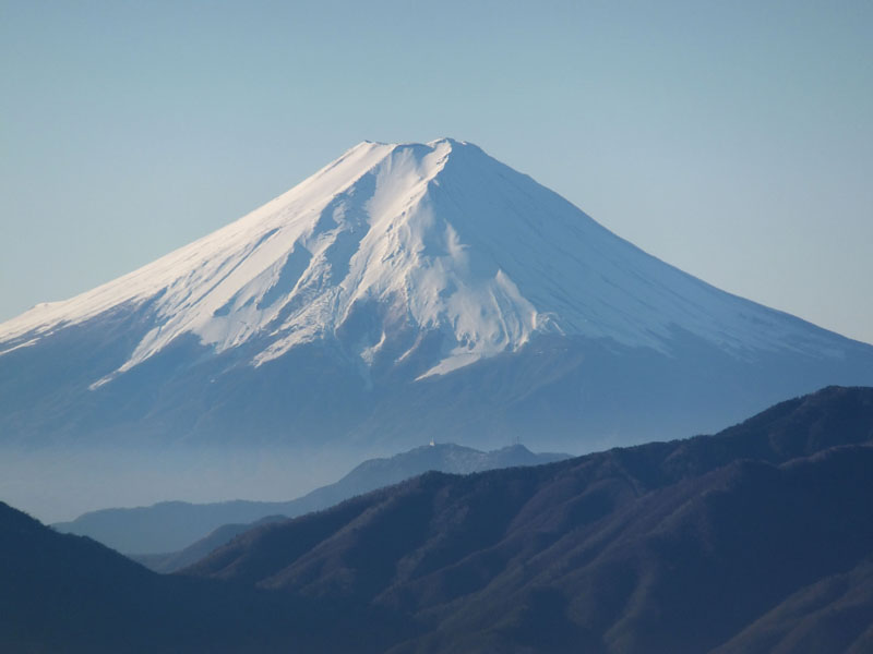 手前の山は三つ峠山で、山頂の山小屋と電波反射板が確認できる。