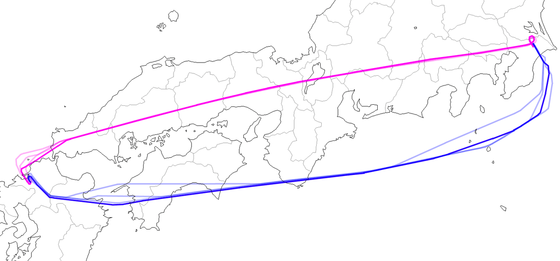 薄い線は、それぞれ前回3回分の飛行ルートを重ねたもの。