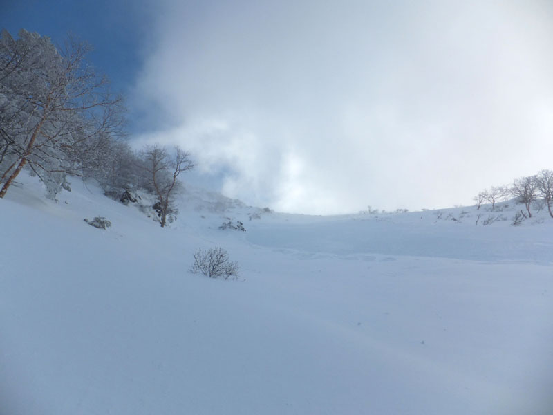 こんなんで雪崩が怖い。撤退。