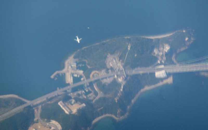 鳴門海峡大橋だ。かなり下を飛行機が飛んでいる。