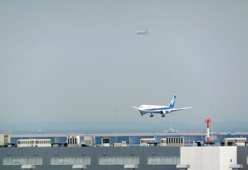 同時並行着陸が運用中で、ANA機が写真のように編隊飛行で降下してきた。