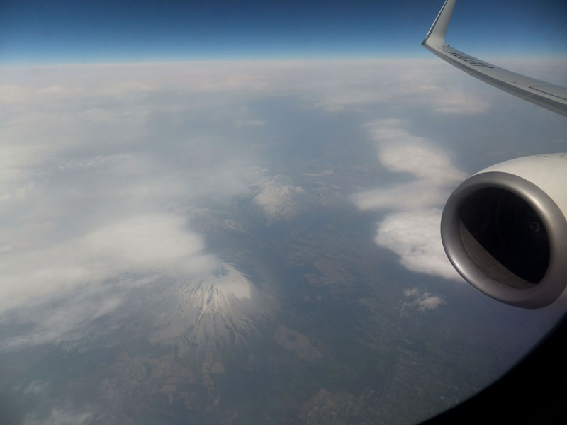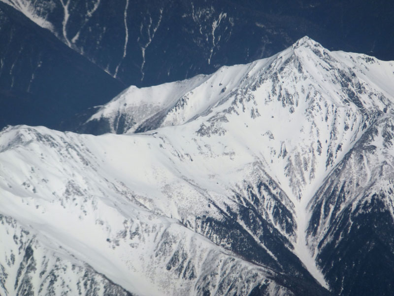 ここで機長からの「左に南アルプス北岳が見えています。一番尖ったものがそれです」