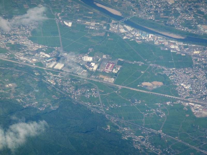 福島・白石蔵王間で、東北新幹線と東北道が並行するところである。