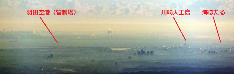 朝陽に照らされ霞む羽田空港が見える。
