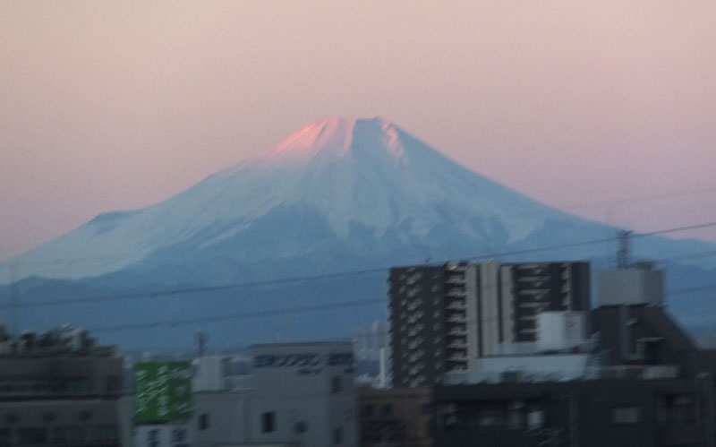 新幹線からは富士山の頂上に朝陽が当たるのが見える。