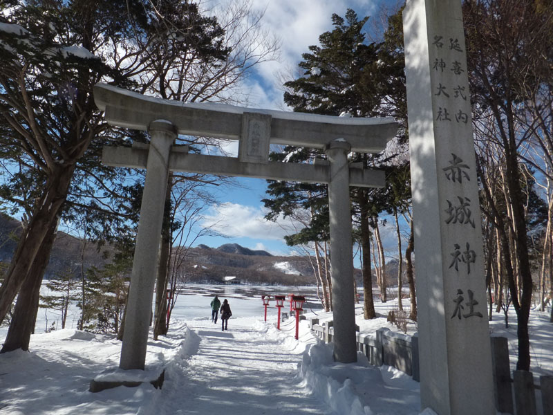 鳥居の先に凍結した大沼がありかっこいい。