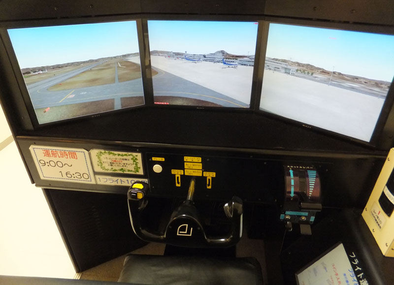 鹿児島空港を再現したフライトシミュレータ。機種はDHC-8-Q400だ。