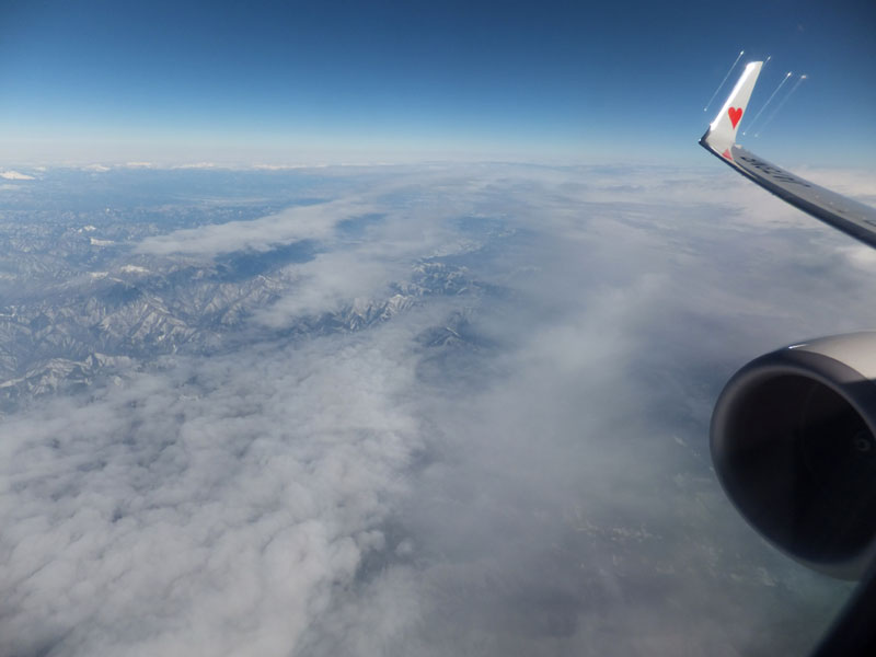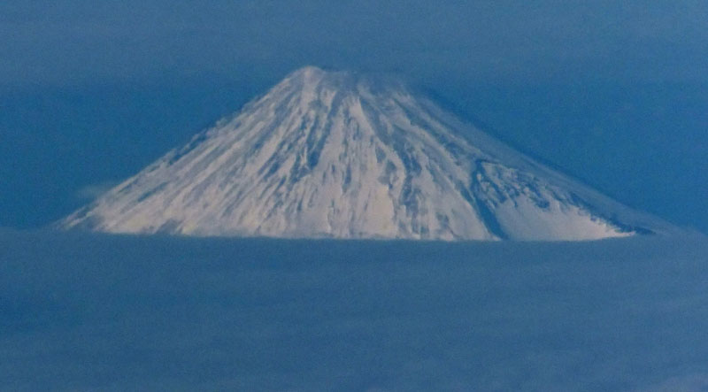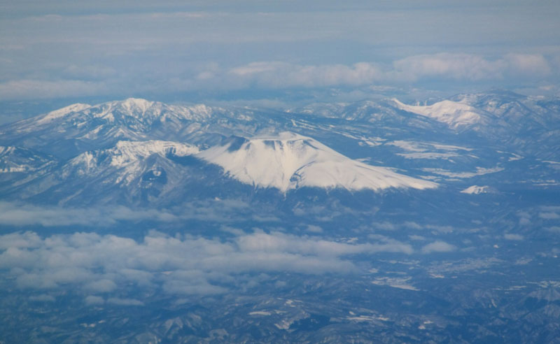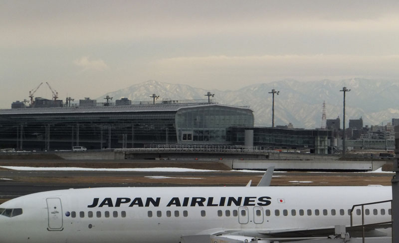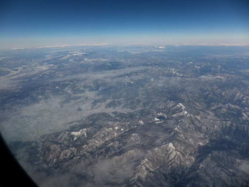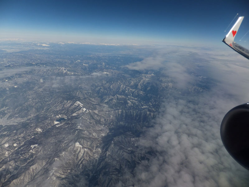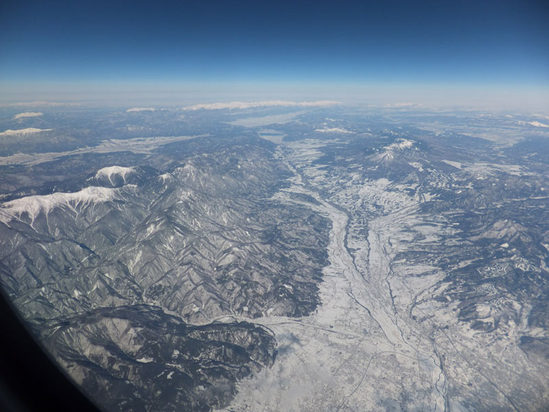 朝の羽田空港からは、先日の大雪で真っ白になった丹沢が見える。