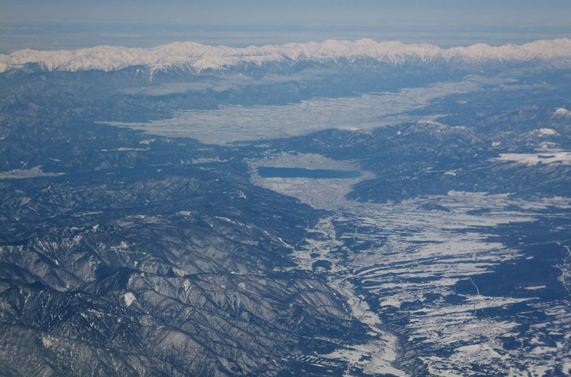 諏訪湖・松本盆地とその奥には北アが壁のように連なる。