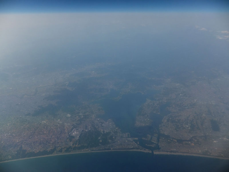 琵琶湖だ。写真では右下の伊吹山が白く見えるが地山が白いだけで雪ではない。
