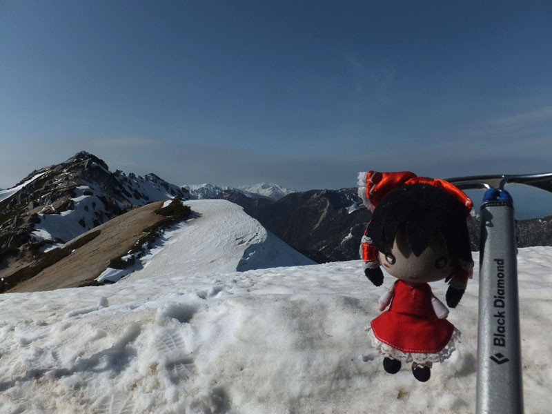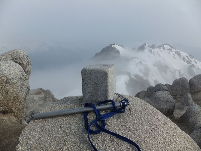 ピッケルは撮影用で、上級者なら6本アイゼン+ストックで十分来れる。