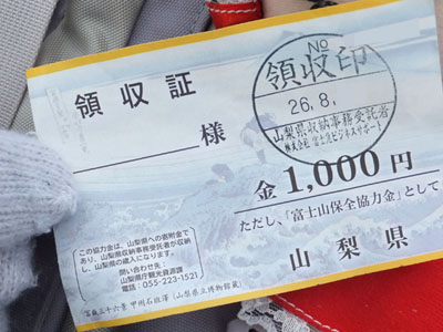 バッジや領収書の色は、ルートごとのテーマカラーだ(吉田口は黄色)。