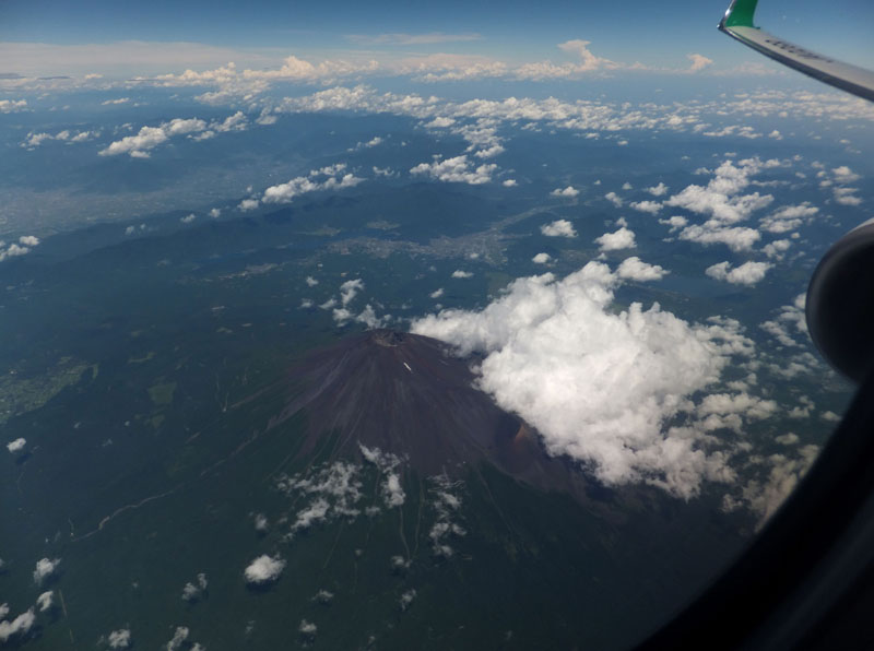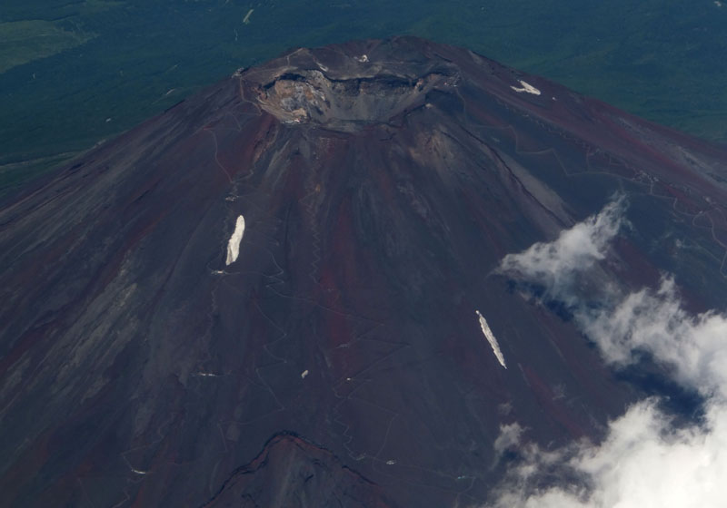 富士山の斜面に見える白い点は富士宮口登山道9合目にある雪渓だ。