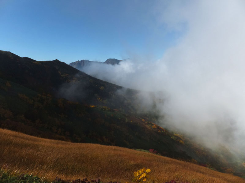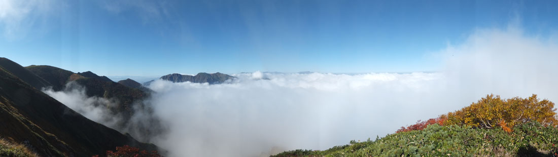 朝日岳はガスに包まれてしまったが、馬蹄形の稜線を一望。