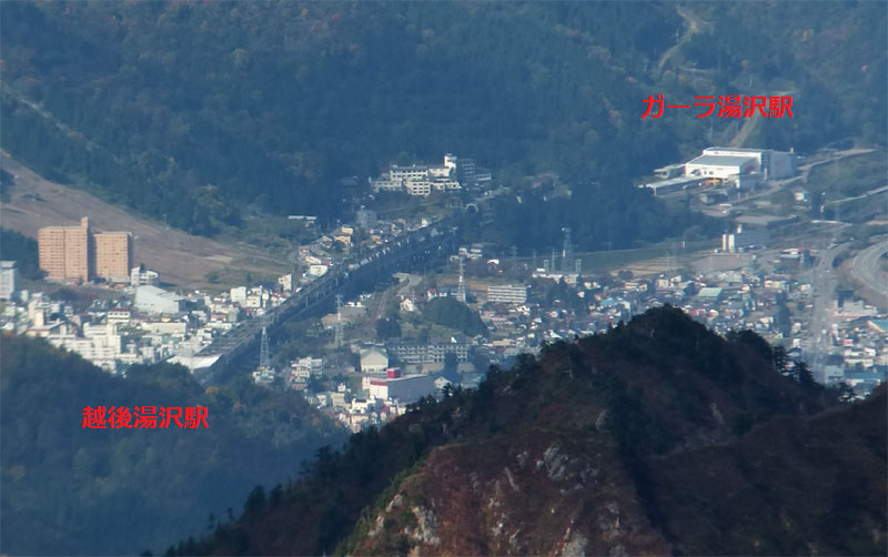 下界には越後湯沢駅、ガーラ湯沢駅が見える。