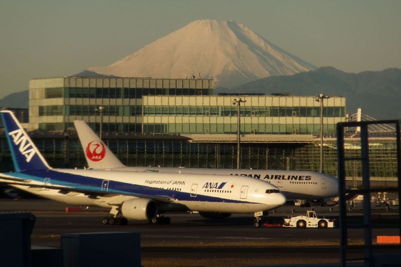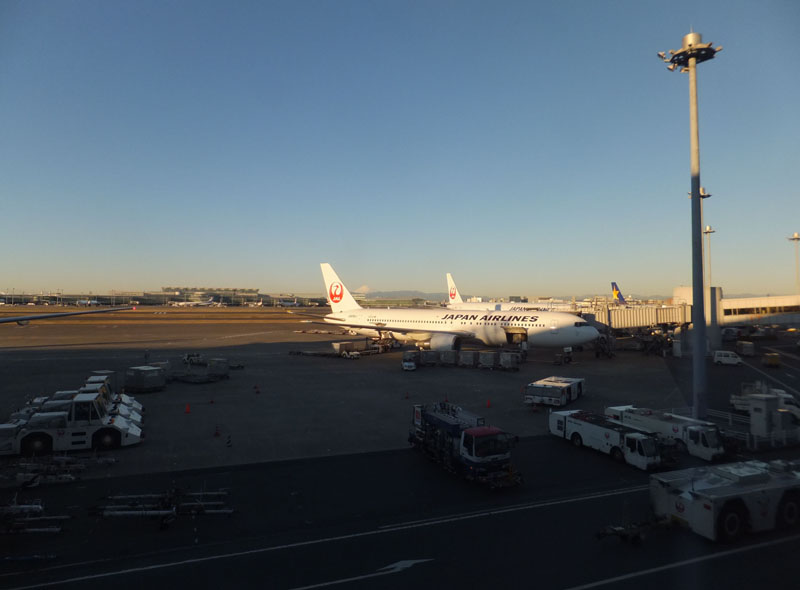 離陸前にはD滑走路から、南アルプスの白峰三山が見える。