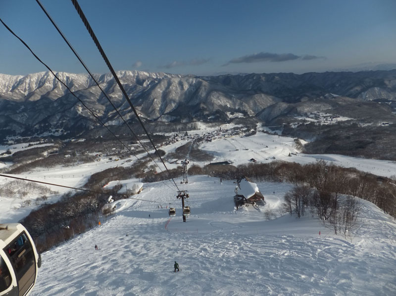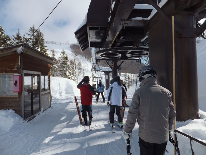 栂池高原スキー場では、まずゲレンデトップまでゴンドラとリフトを乗り継いでいく。