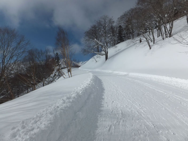 ゲレンデトップからはしばらくは圧雪された林道だ。