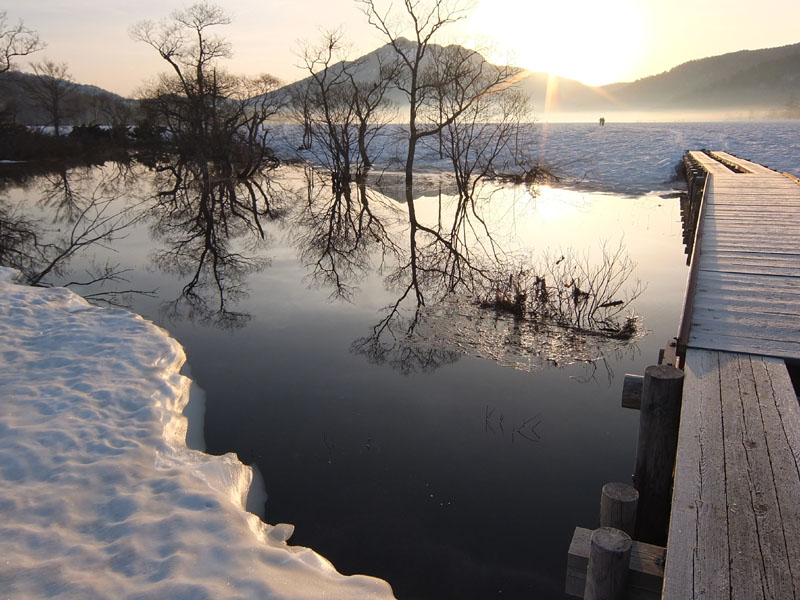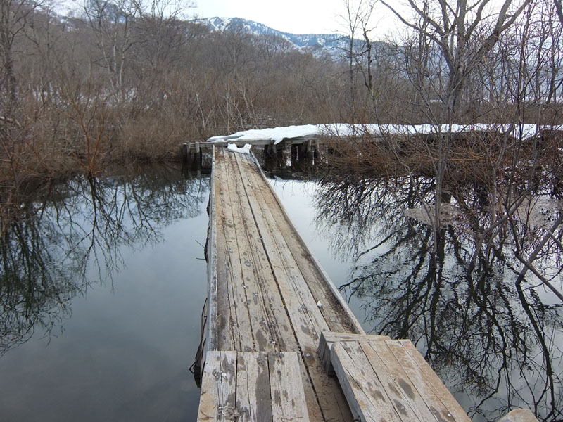 雪に隠れた木道の下には空洞があり落ちないように要注意。