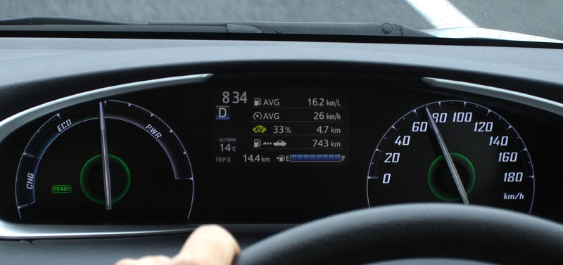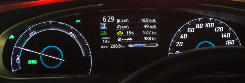ハイブリッド車らしく、回転計ではなく出力計だ(トルク×回転数=出力)。