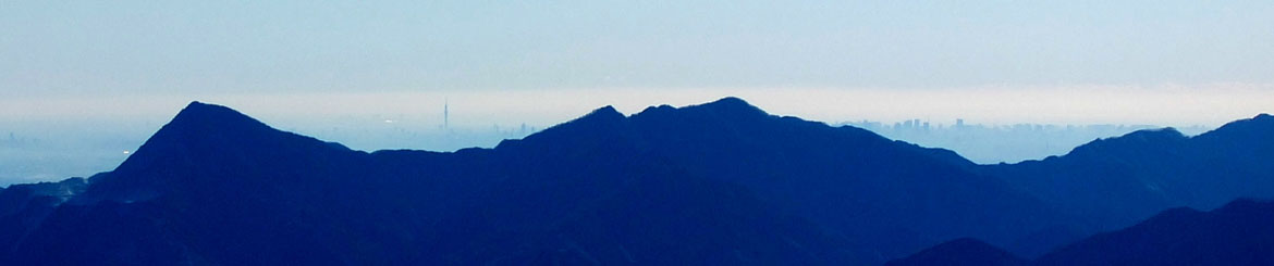 武甲山〜大持山の稜線の先には、東京の摩天楼とスカイツリーが見える。