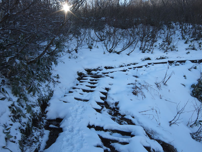天神平に行くとなんと雪が非常に少ない。積雪10cmほど。