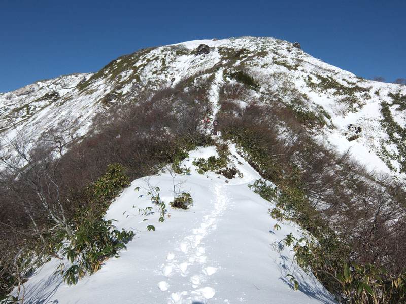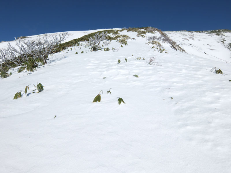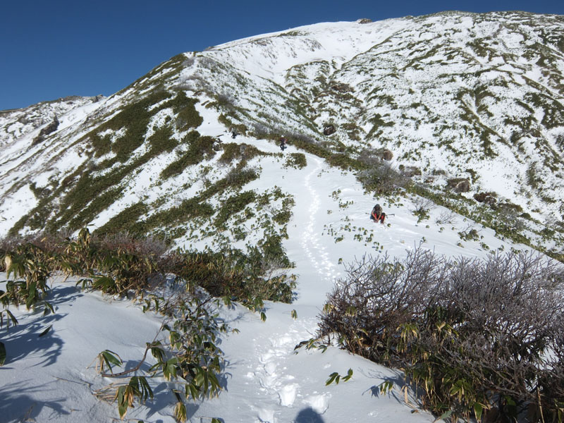 夏道に沿ってトレースをつけるか、直登するか迷う。