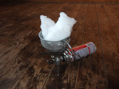 雪を溶かして雑用水(手洗い・洗顔・歯磨き・レトルト加熱用)を作る。