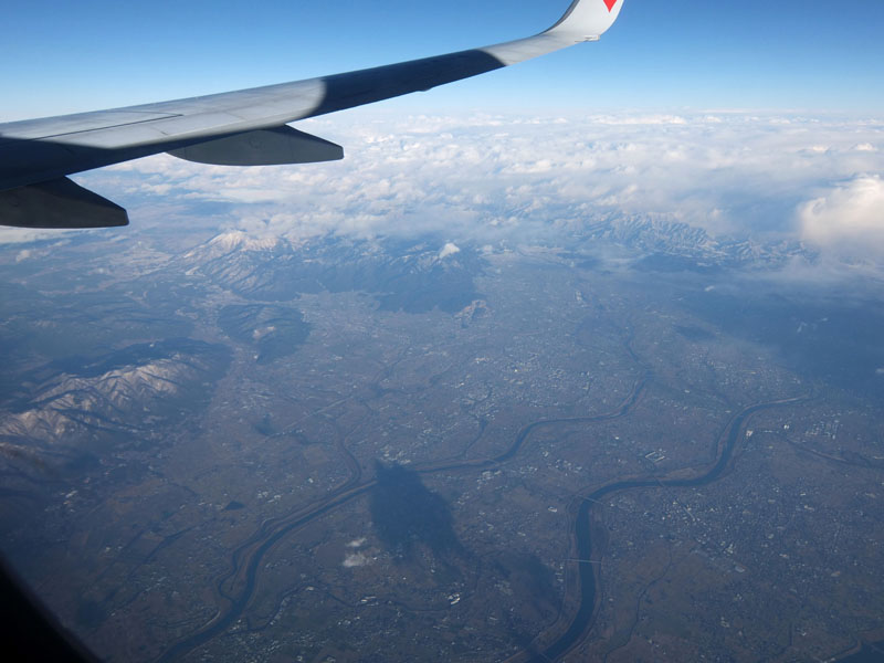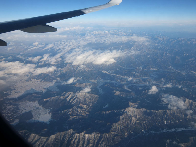 名古屋上空を通り関が原の雪のエリアへ。