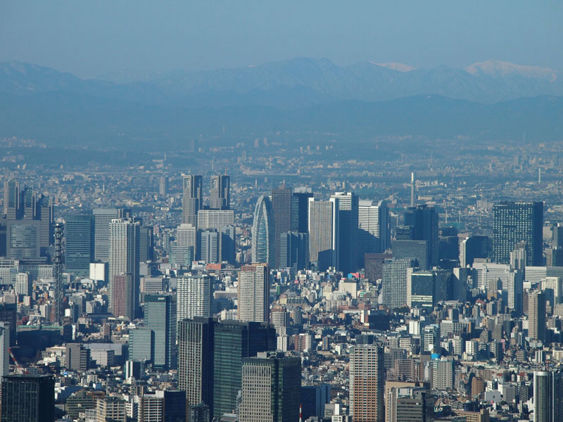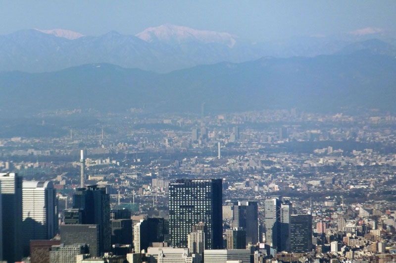 新宿の奥に見えている雪山は南アルプスだ。