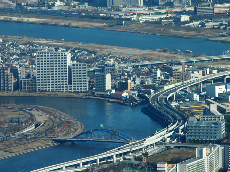 首都高が河川堤防上を活用して作られているのがよくわかる。
