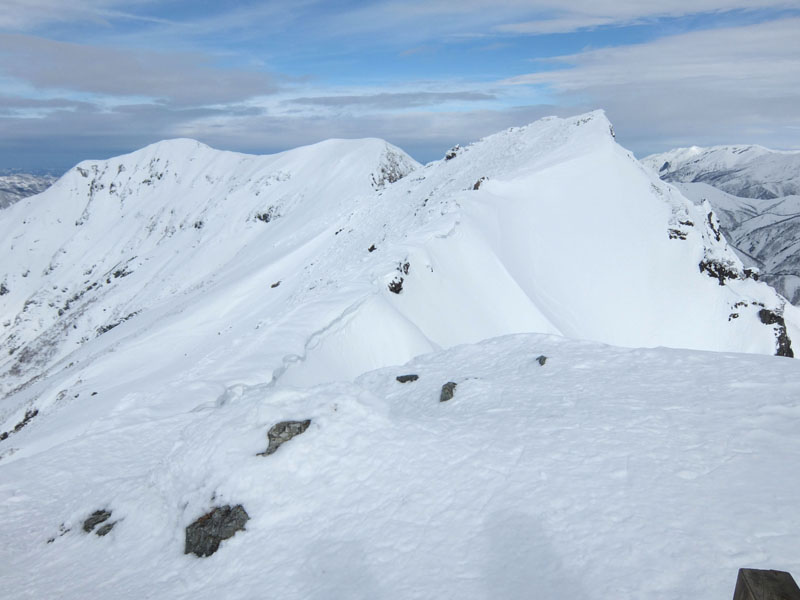 雪が一部硬く、ピッケルがないと越後側に落ちる恐れがあるため、
