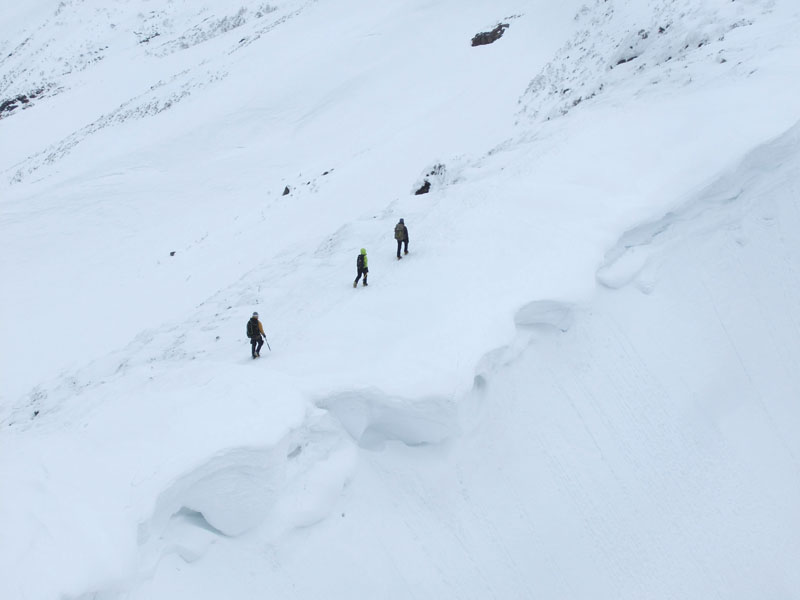 気温が高いためかあちこち雪崩ており、ときおり音もする。