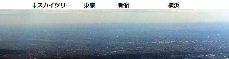 非常にかすかだが東京スカイツリーや東京、新宿、横浜の摩天楼が見える。